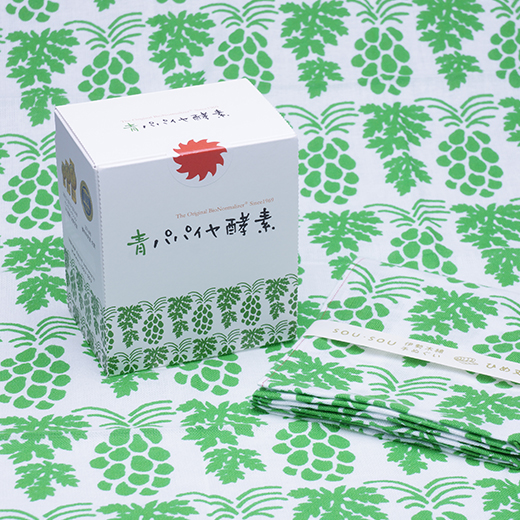 虽然很少有人不知道青木瓜这一名称,但对于其形状和颜色却是一脸茫然。经常也会听到有人说与芒果难以区分。既然这样,我们便决定在包装上设计青木瓜的插图。进行设计的是世界上著名的纺织设计师脇坂克二老师。