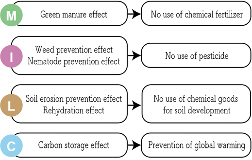 共生的根瘤菌固定空中氮,用根合成氮肥。此外,深根性有排水性改善效果。