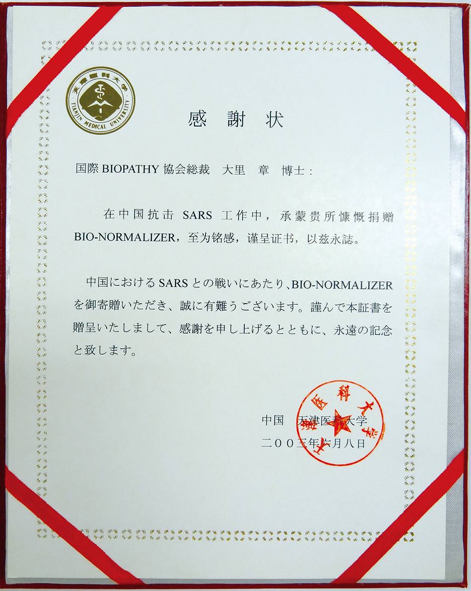 年向天津国立医科大学实施人道活动。赠送“Bio-Normalizer”。