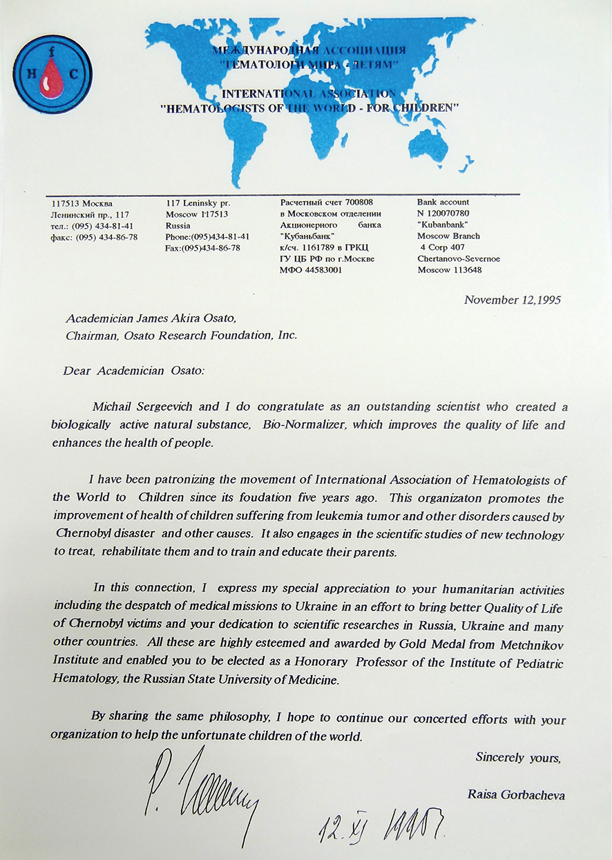 得知在对切尔诺贝利核电站的被辐射事故导致的许多被辐射受害者的人道主义使命中取得了戏剧性的成果后,戈尔巴乔夫前总统和莱莎·戈尔巴乔夫夫人授予了感谢信。(1993)