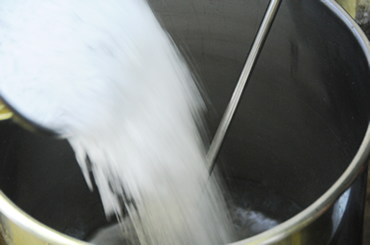 加热已混合的皂基进行皂化。由于是在100度以上高温进行数小时加工,因此对不耐热成分产生影响。